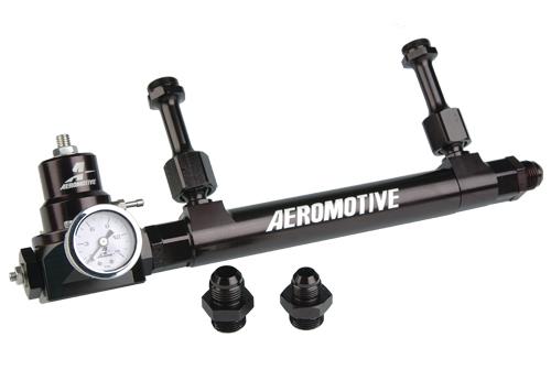 The new Aeromotive Fuel Log incorporates features never before available. Each carburetor inlet features a ball and socket assembly that swivels +/-20 degrees, allowing additional clearance for throttle stops, nit rous plates and other accessories; then locks in place at the desired position. This product is not legal for sale or use on emission-controlled vehicles except when used as a direct replacement part matching OEM specifications. The telescoping log will fit 4150 or 4500 Dominator (P/N 14201) and Demon (P/N 14202) carburetors. The ORB-10 inlet and outlet ports will feed the hungriest big blocks, and adapt easily to Aeromotive P/N 13212 (A2000 Bypass – gasoline) or P/N 13214 (Double Adjustable Bypass – alcohol) fuel pressure regulators.