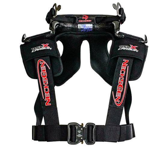• SFI 38.1 REVX Carbon Head and Neck Restraint • Adjustable tether length to suit any seat angle and any neck length • Lightweight carbon fiber chassis • Breathable mesh padding • Quick release helmet hardware is included • 3" wide belt channels allow for 2" or 3" wide shoulder harness • Vertically adjustable chest straps adjust to fit men and women both easily • Ergonomic "X" shape allows relief at spine area • Elastic belt keepers and lightweight tactical quick release buckle • Generous dual horizontal adjustable chest straps • Low profile rear section • Available Sizes: 3" chassis with Medium/Large harness or XL+ harness • Weight: 1.8 lbs including harness and tactical buckle